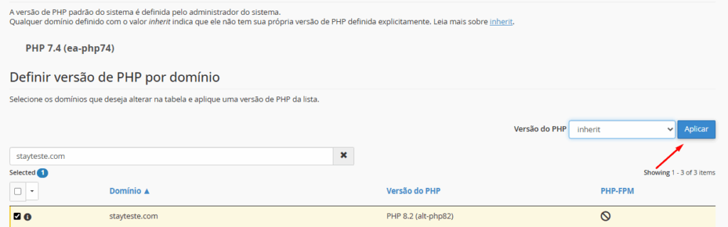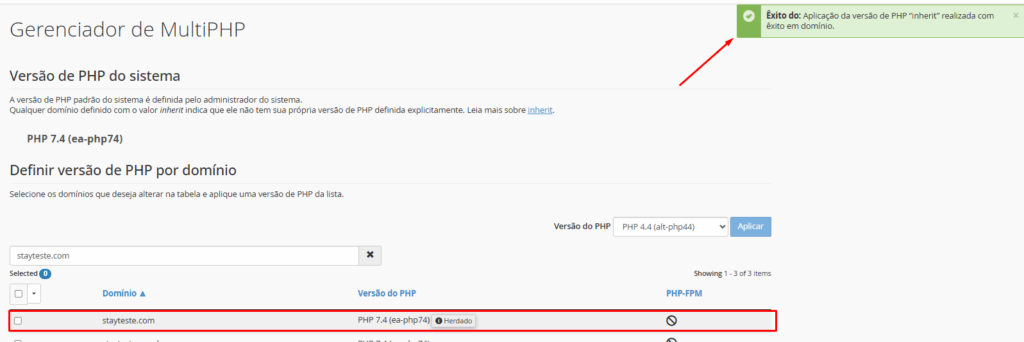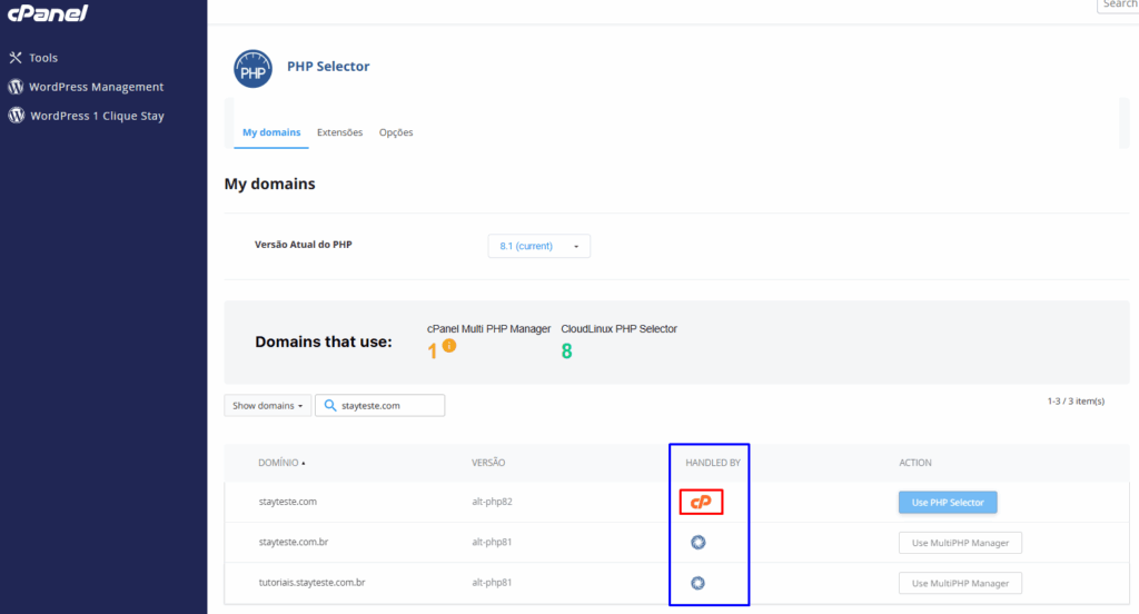 Dentro do gerenciador, veja se o seu domínio está com a versão “herdada pelo cPanel”. Essa indicação mostra que o PHP está sendo controlado de forma incorreta e precisa ser ajustado.