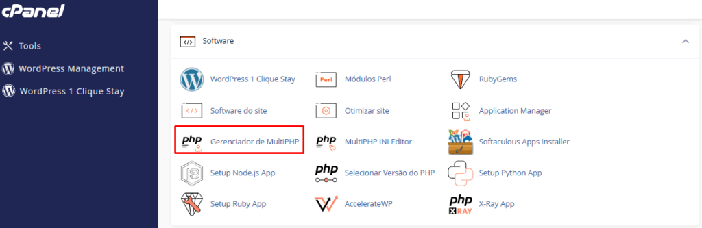 No cPanel, localize a seção Software e clique em Gerenciador de MultiPHP. Essa ferramenta exibe os domínios da conta e a versão de PHP configurada para cada um.