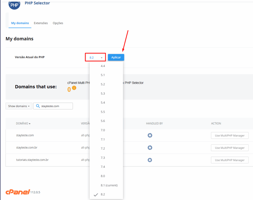 No PHP Selector, escolha a versão desejada (exemplo: PHP 8.2) e clique em Aplicar. A partir desse momento, todos os domínios da conta passam a usar a versão definida.