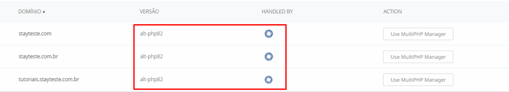 ⚠️ Observação importante: No ambiente da StayCloud, a versão do PHP é global para toda a conta. Alterações individuais por domínio via MultiPHP Manager podem causar conflitos. Sempre utilize o PHP Selector para definir a versão oficial.