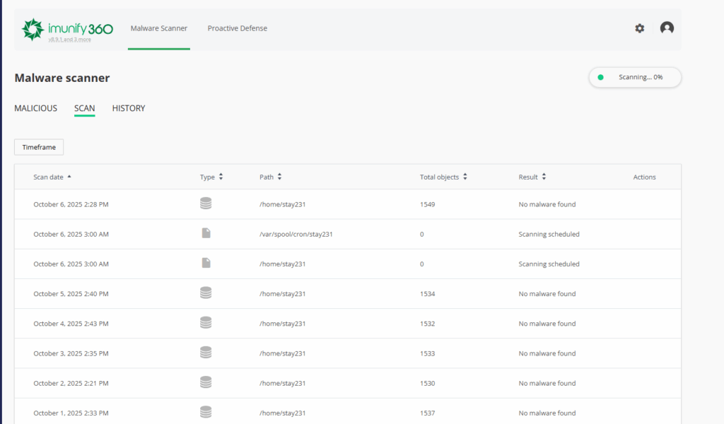 A seguir, você verá como acessar e verificar se há arquivos maliciosos em seu site utilizando o painel Imunify360.