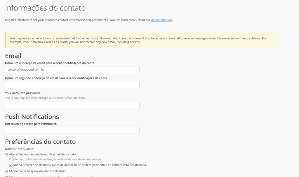 Esse será o e-mail principal de comunicação entre o cPanel e você. - Use um e-mail externo (como Gmail, Outlook ou outro domínio) para garantir que as mensagens sejam entregues corretamente.